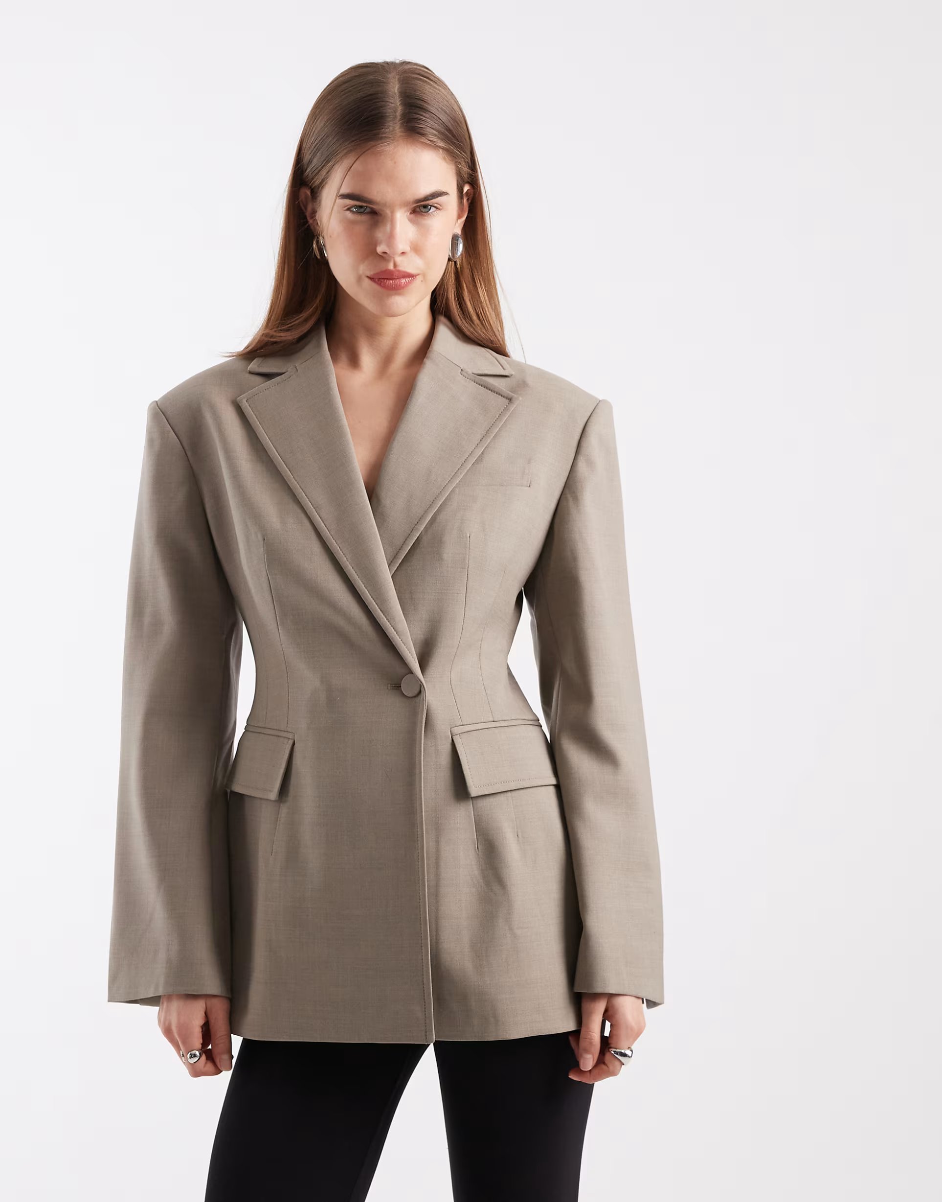 The ASOS Sculpted Wool Blazer with Padded Shoulders in Mole Brown is ideal for work, business, casual.