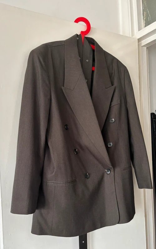 This dark green blazer features an oversized fit and a double-breasted front with multiple buttons for a classic and structured look. Perfect for formal and business occasions.
