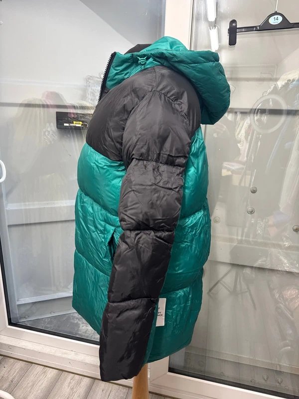A chic black and green puffer coat with a hood and padded lining, perfect for the colder months.