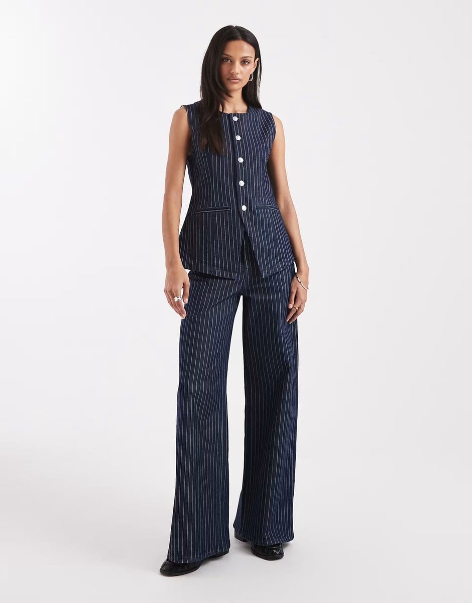 The ASOS Pieces Pinstripe Wide Leg Jeans Co-ord in Dark Blue is ideal for casual, smart-casual.