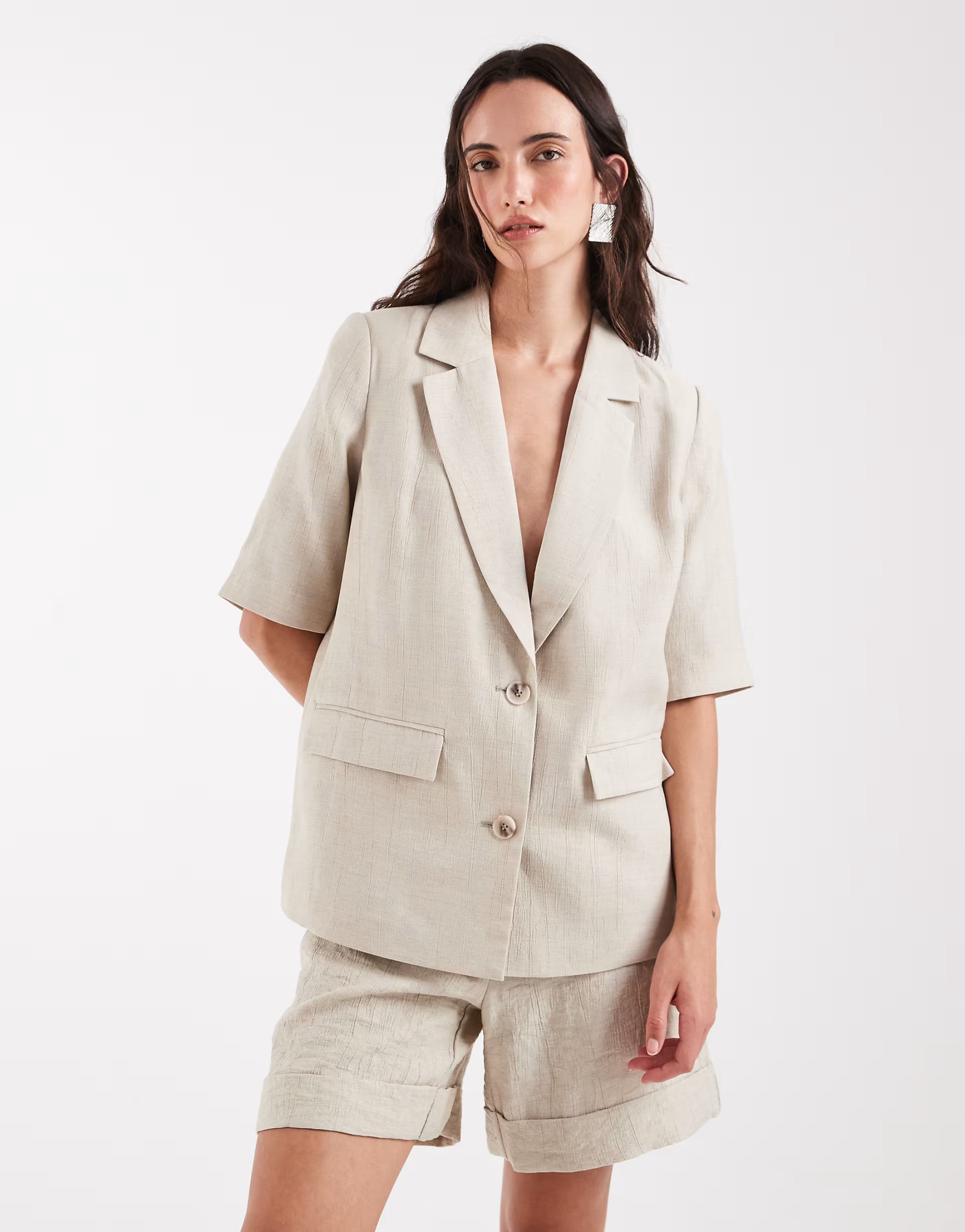 The ASOS Pieces Cream Short Sleeve Blazer Co-ord is made from linen-look.