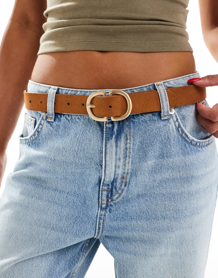 Stylish cognac suede belt with a gold double buckle from ASOS. Perfect for adding a touch of elegance to any outfit.