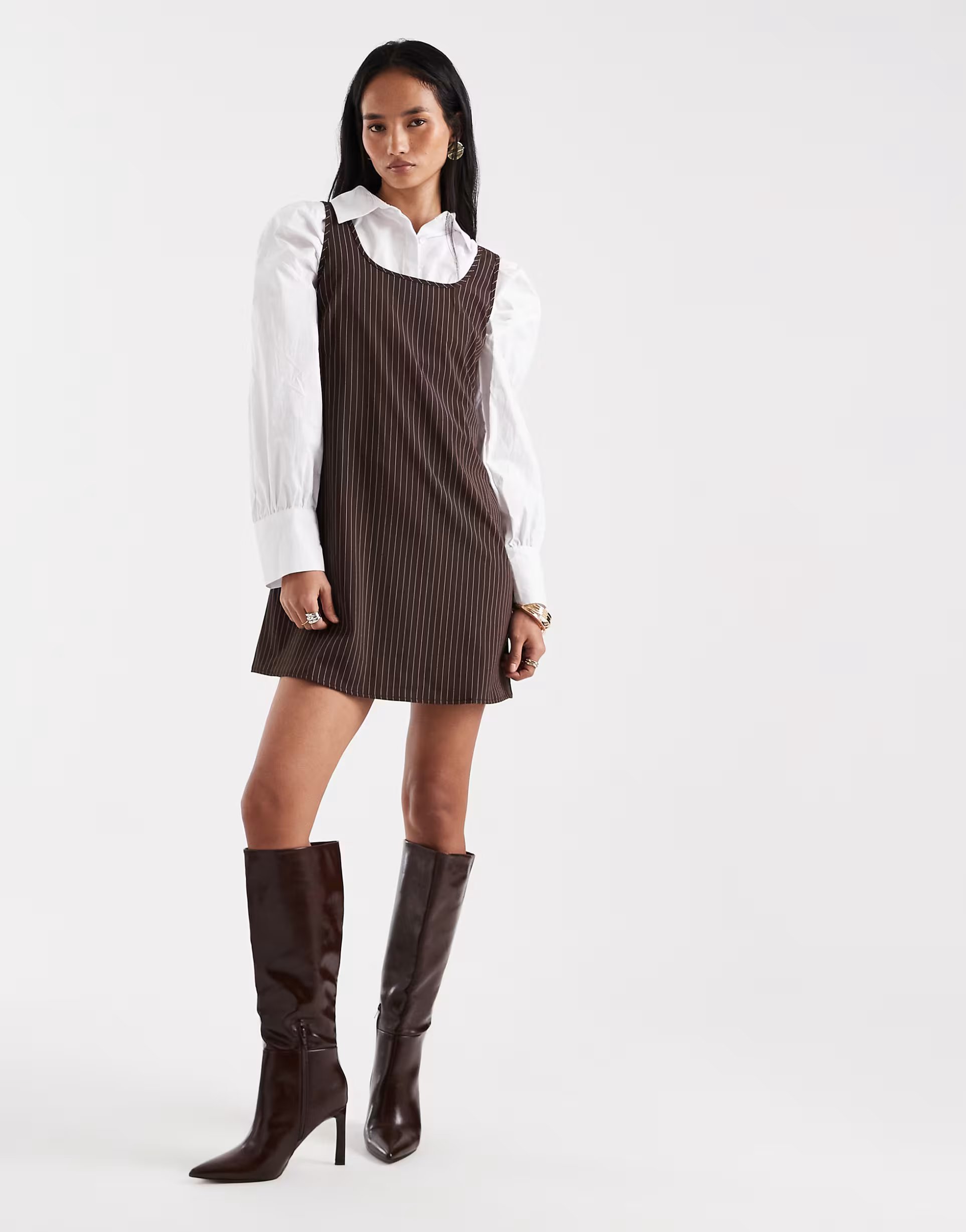 Elegant and timeless, the chocolate brown pinstripe tailored mini dress from ASOS boasts a sophisticated fit and flare silhouette perfect for any occasion.