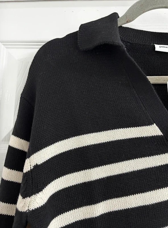 The ASOS V Neck Stripe Jumper in Black and Cream is available in sizes S.