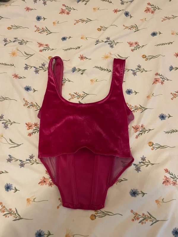 Pink Velvet Corset Top from ASOS — a striking addition to your wardrobe. Designed in vibrant pink, this corset top features a mesh panel for a touch of allure. Crafted from velvet and mesh, it offers a luxurious feel and a form-fitting silhouette. Perfect for adding a glamorous touch to any outfit.