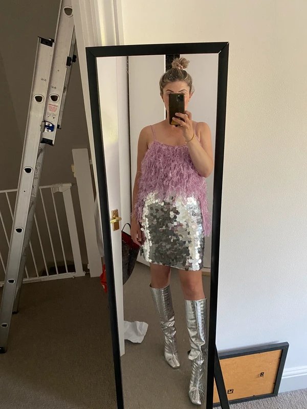 Pink Feather Style Bodysuit from ASOS LUXE range. Lilac/pink colour thong bodysuit, longer at the back to flow over trousers. Has a zip at the back. Feather style material. Perfect for the Eras Tour Taylor Swift.