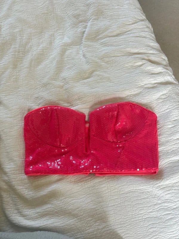 This pink sequin crop top from ASOS features a bandeau neckline and strapless design. The sequin embellishments add a touch of glamour, making it perfect for a night out or special occasion.