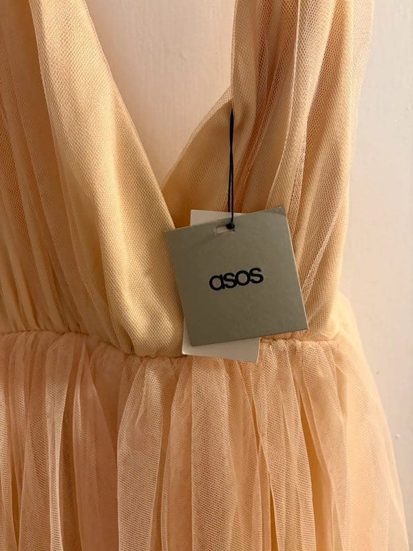 Charming ASOS pink tulle ballerina-style dress with a flattering deep V neckline, delicate sheer mesh straps, and a floaty layered tulle skirt. Ideal for special occasions or evening events.