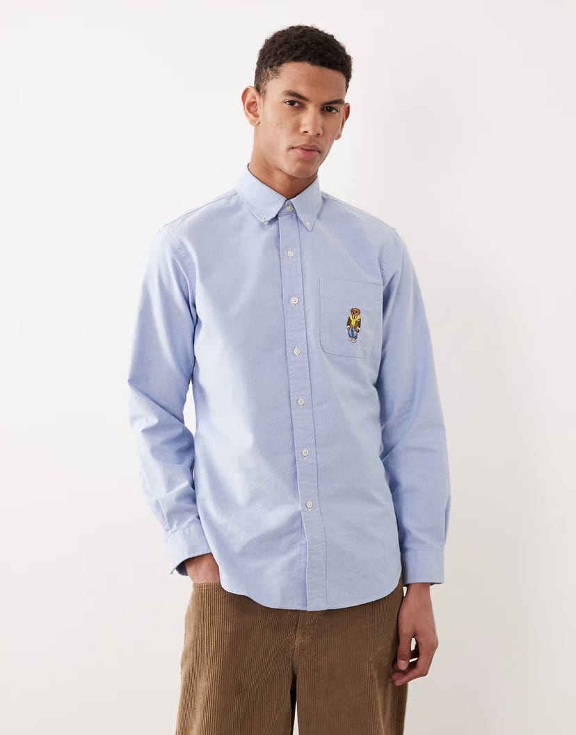 Crafted from a premium cotton blend, this light blue oxford shirt by Polo Ralph Lauren features a button-down collar and a distinctive heritage bear logo on the left chest for a subtle yet iconic touch.