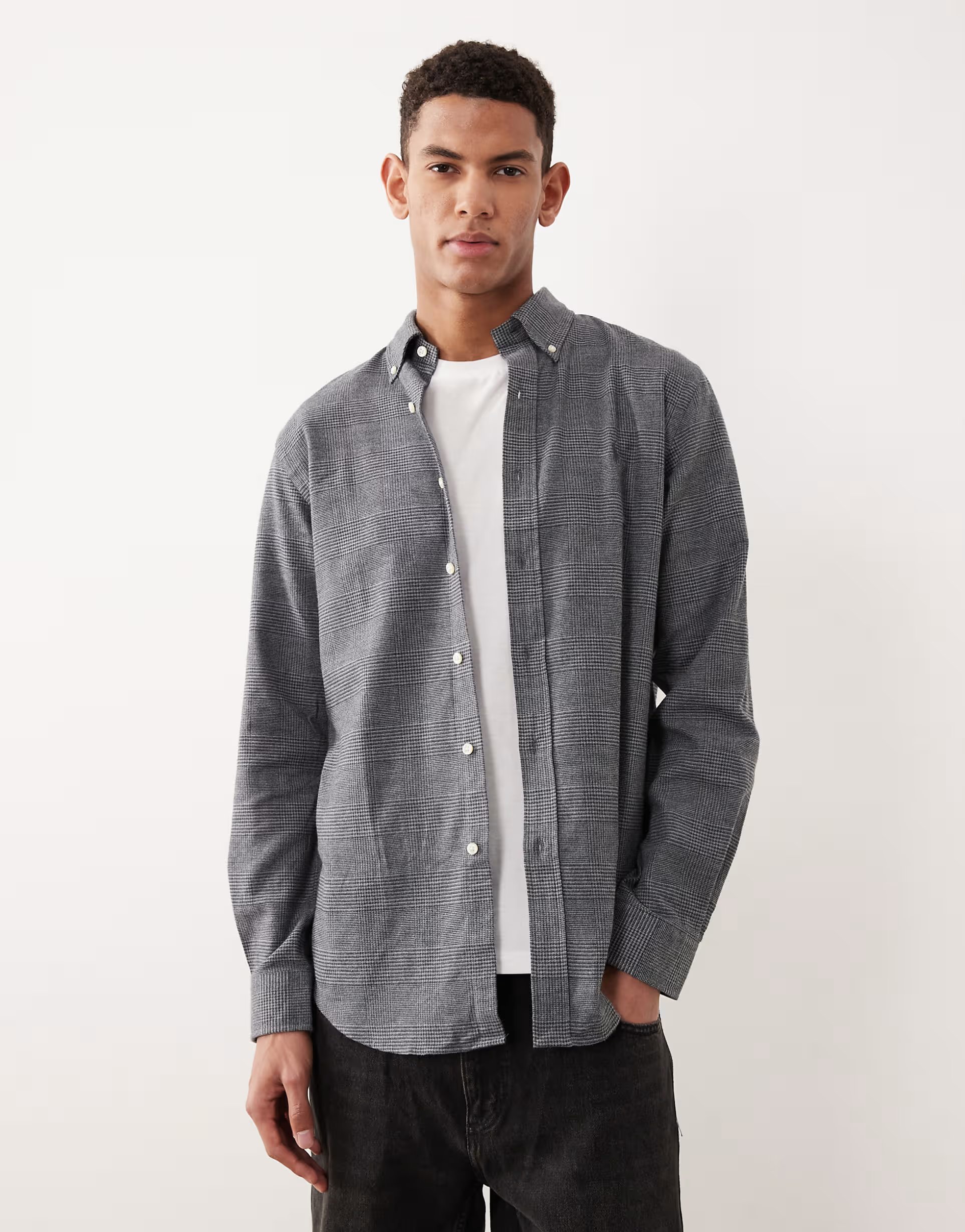 Designed with a dogtooth pattern and brushed finish, this grey marl long-sleeve shirt features a spread collar and a button closure. Perfect for a smart-casual look.