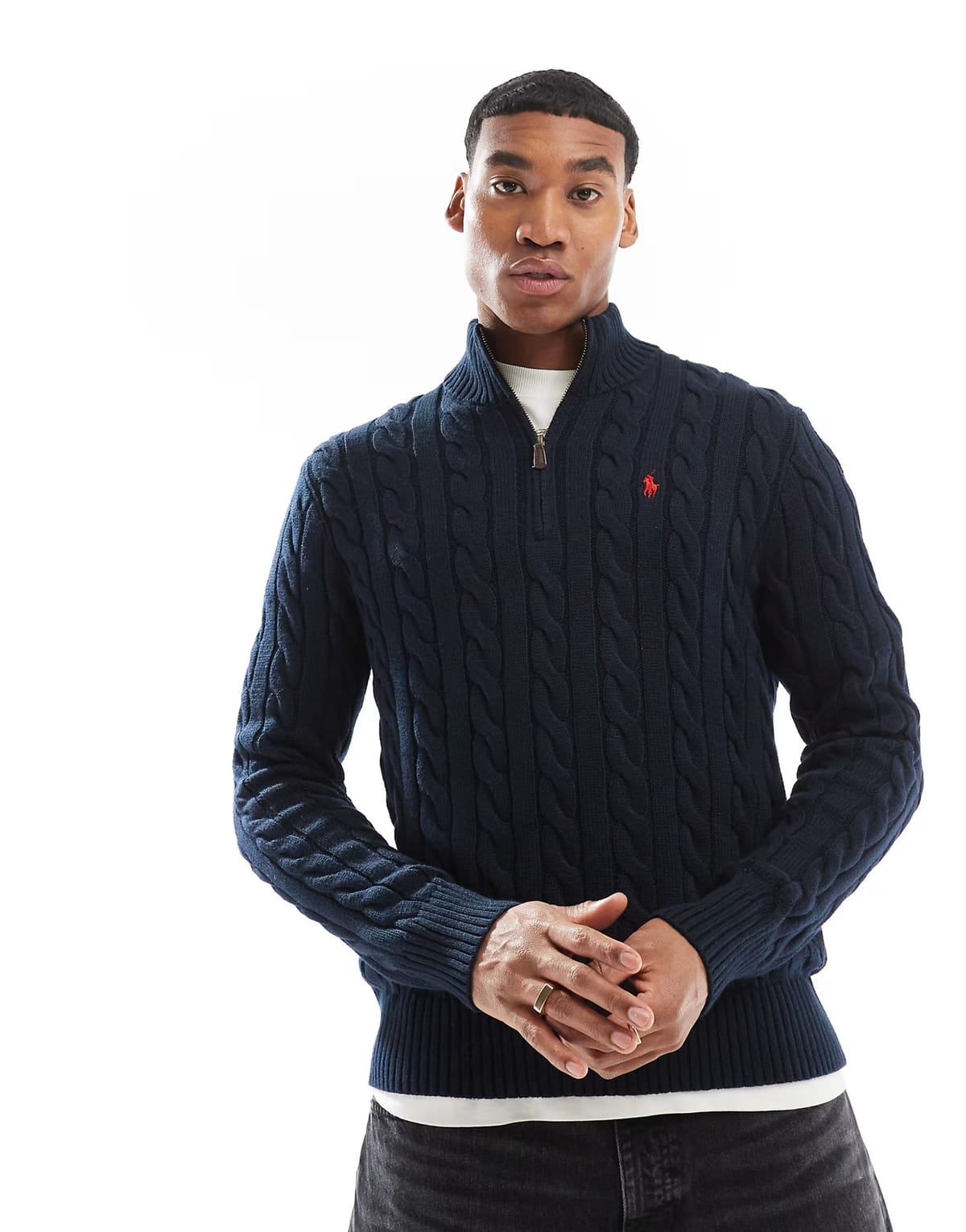 The ASOS Polo Ralph Lauren Cable Knit Half Zip Jumper in Navy is available in sizes XXXL, XXL, XL, XS, L, M, S.