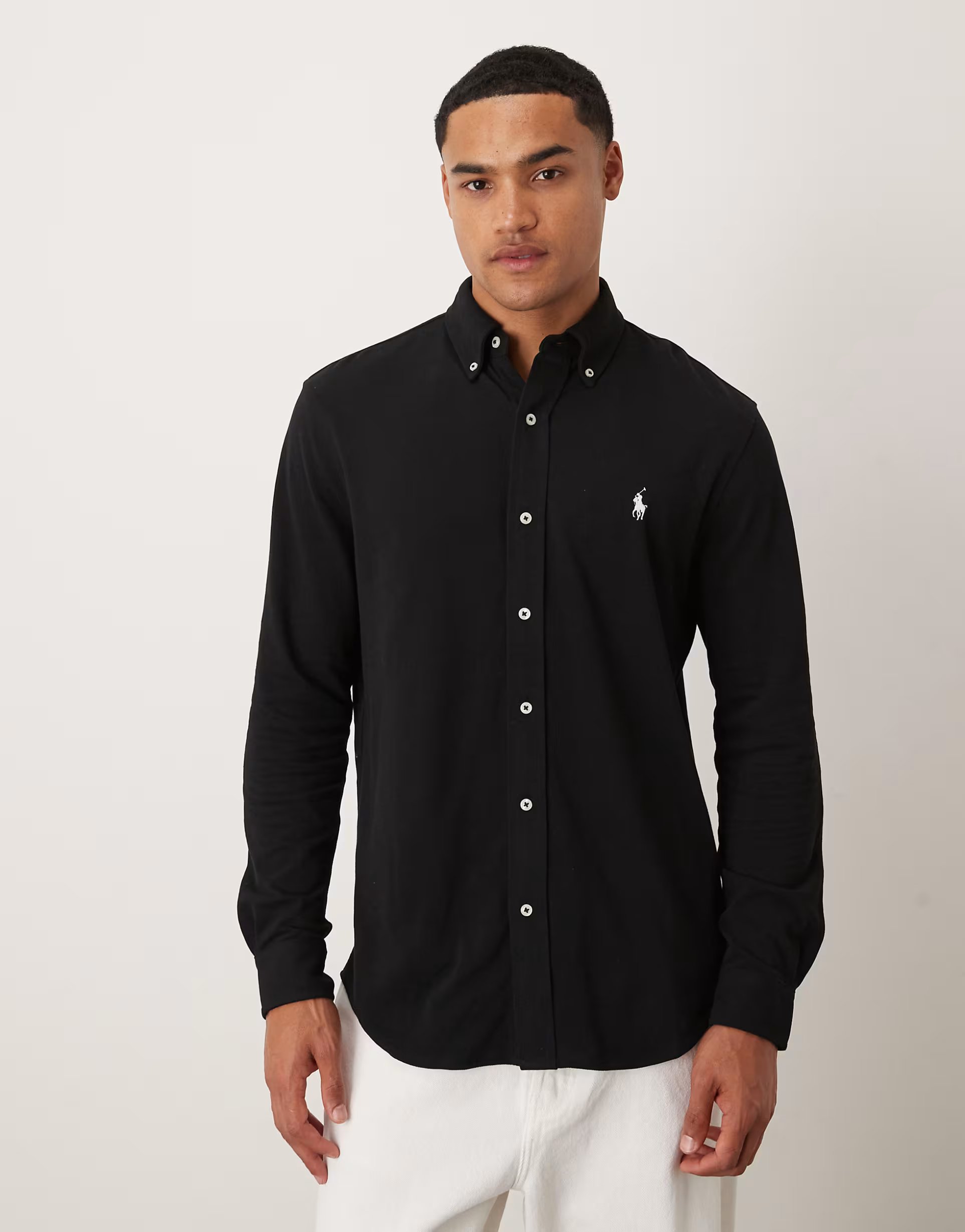 The Polo Ralph Lauren icon logo pique shirt in black is a stylish addition to any wardrobe. Featuring a button-front closure and long sleeves, this shirt is perfect for casual wear.