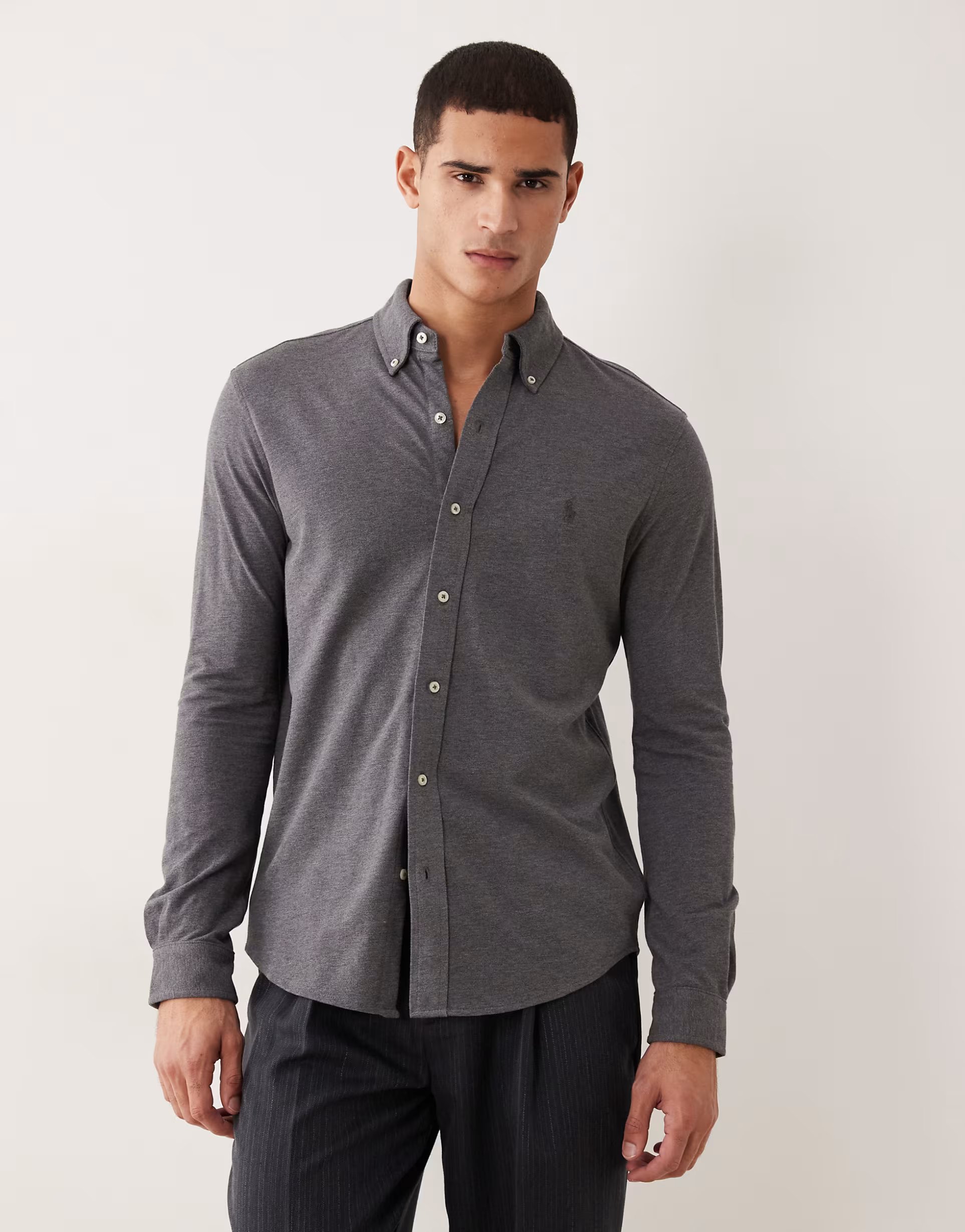 The ASOS Polo Ralph Lauren Long Sleeve Shirt in Charcoal Marl is made from cotton, polyester, elastane.
