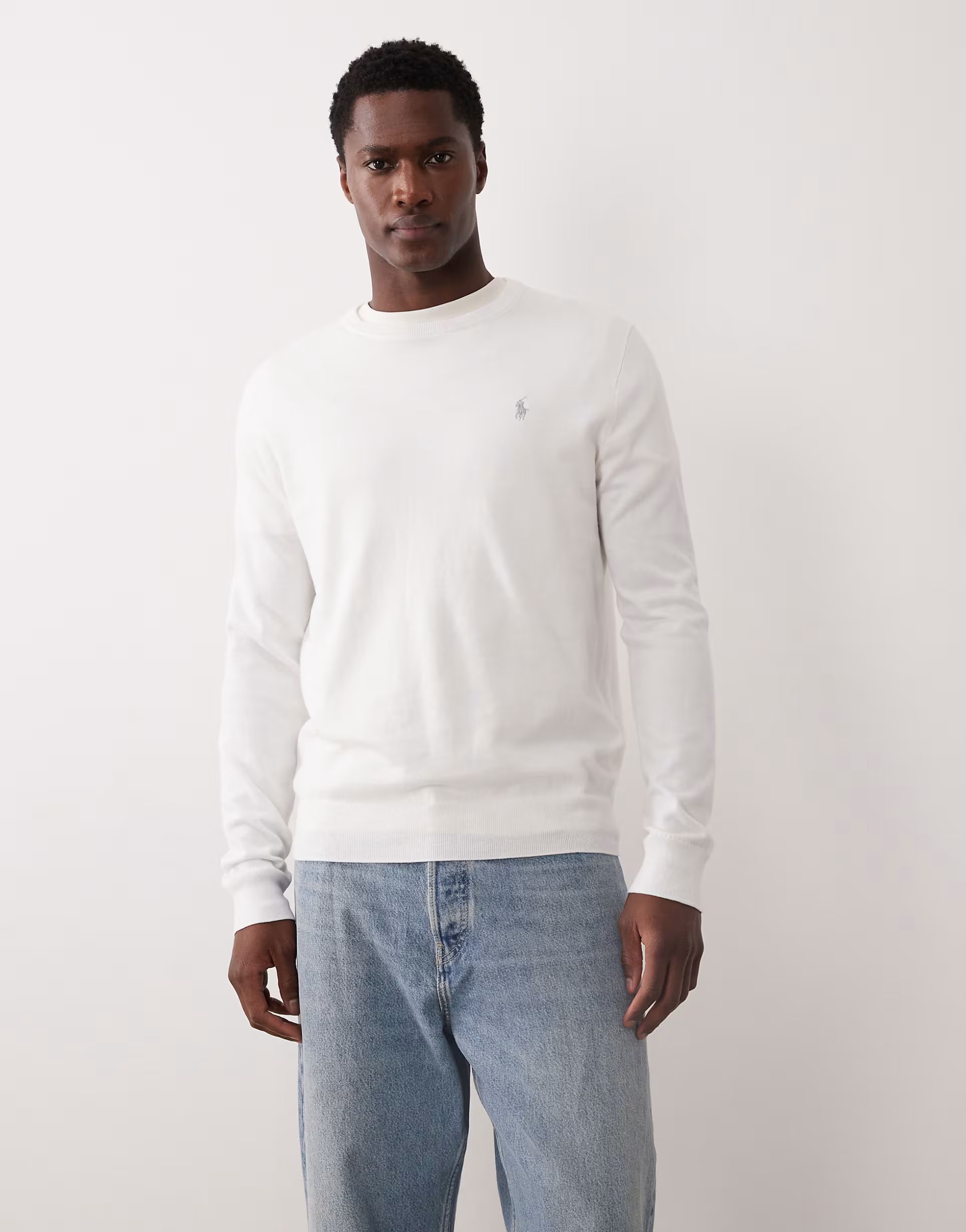 This white fine knit jumper from Polo Ralph Lauren on ASOS features a slim fit and logo detailing. Perfect for casual and smart-casual occasions.