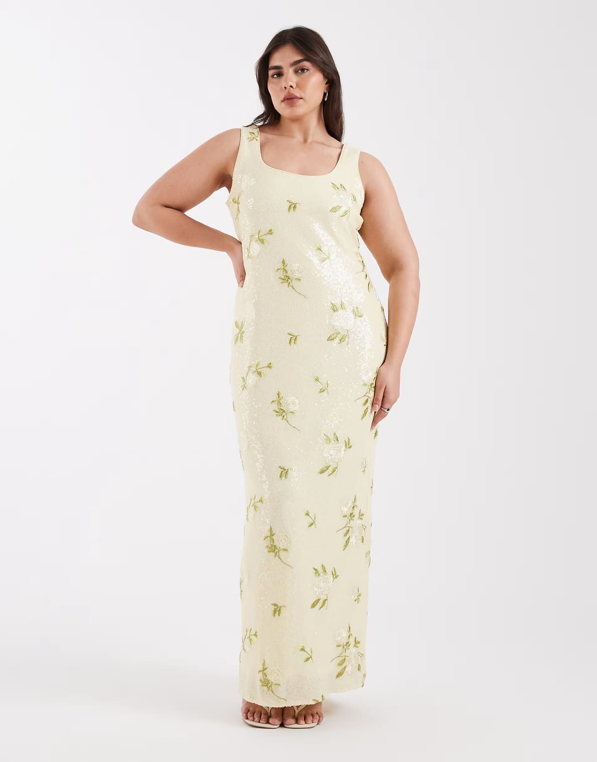 The ASOS Lemon Floral Sequin Scoop Neck Maxi Dress is available in sizes XXXL, XXL, XL, XS, L, M, S.