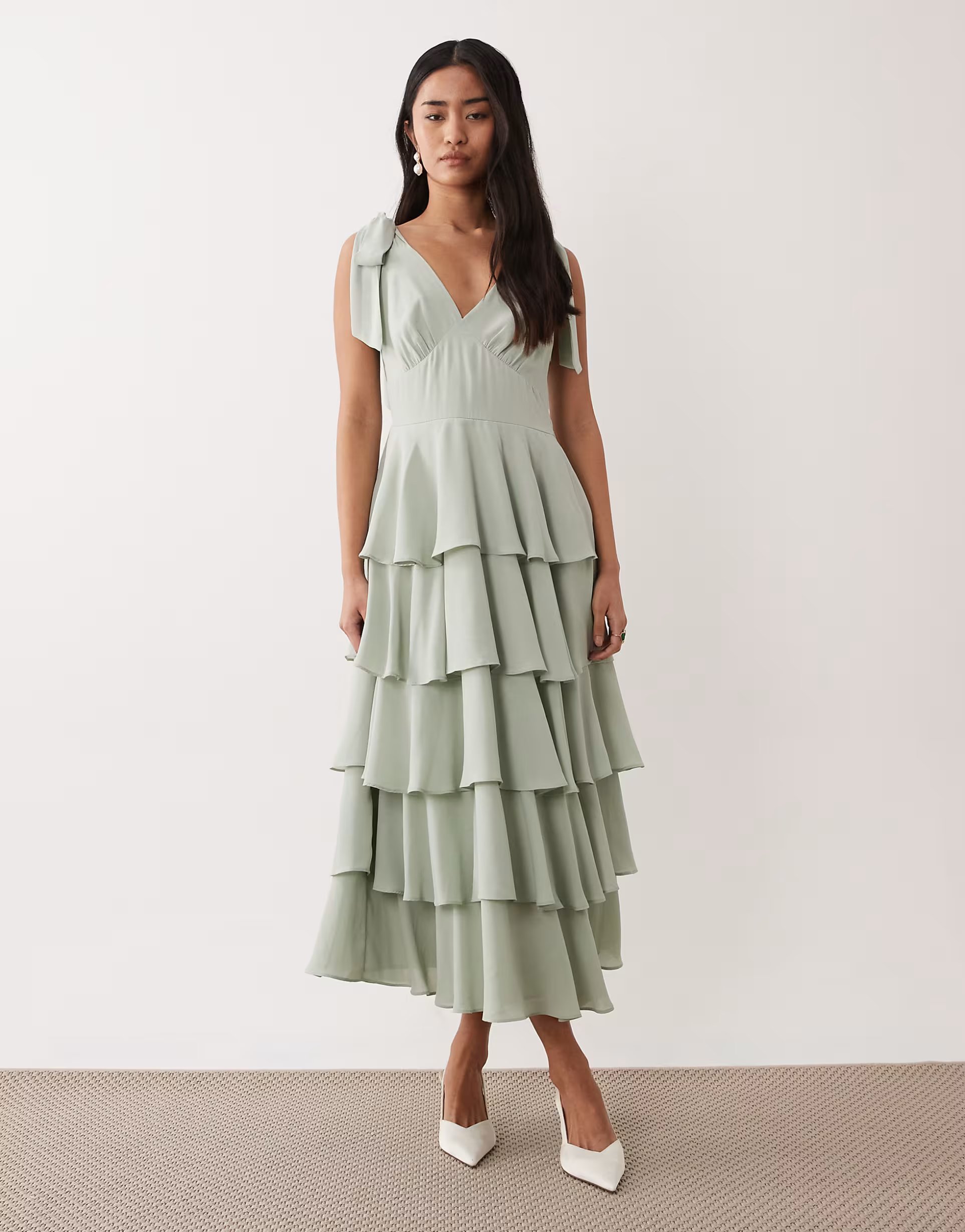 This Pretty Lavish midi dress boasts a sage green hue with tie shoulder detailing and ruffled layers. Perfect for an elegant evening out, the dress features a flattering V-neckline and adjustable straps.
