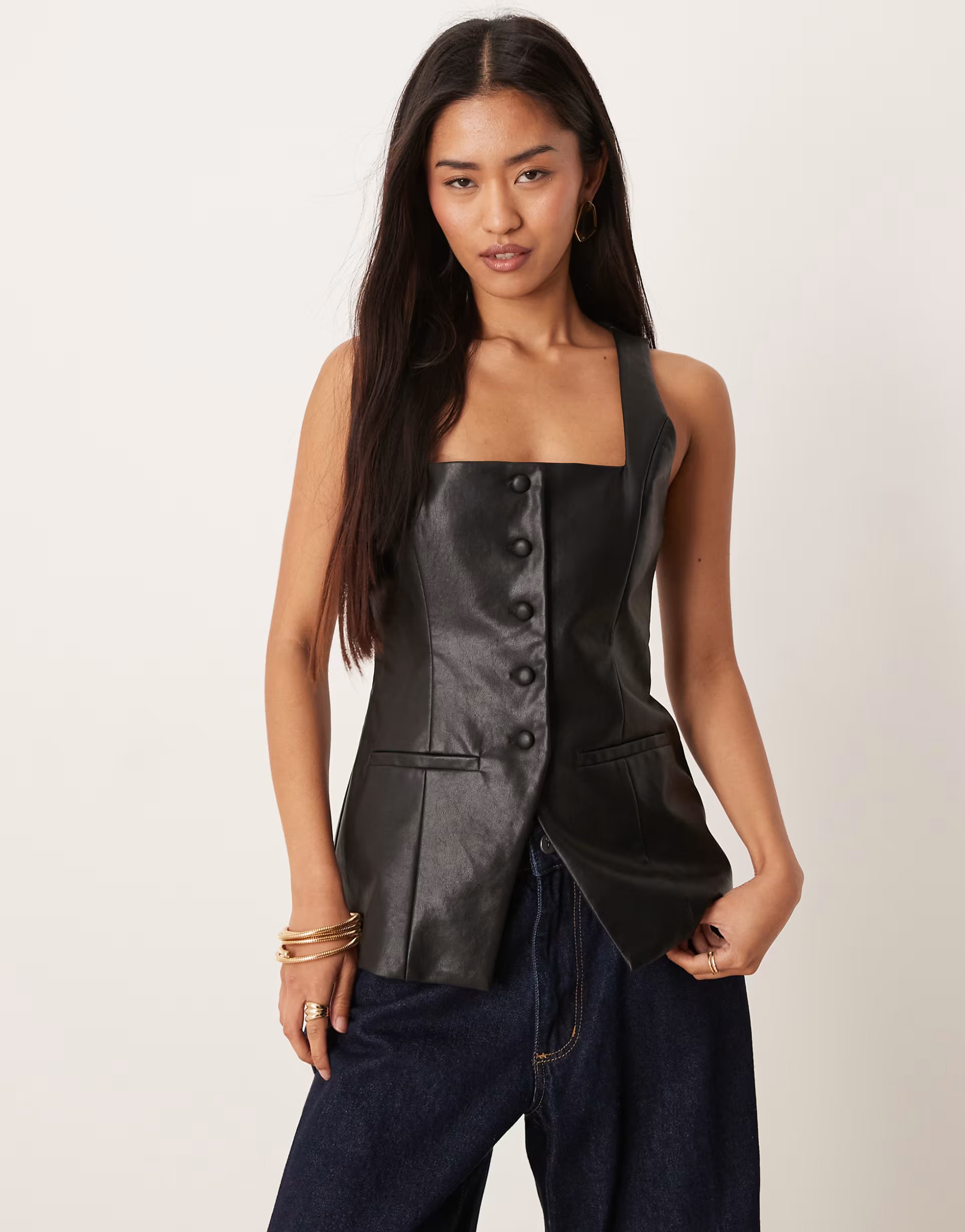 The ASOS Leather Look Longline Waistcoat in Black is ideal for work.
