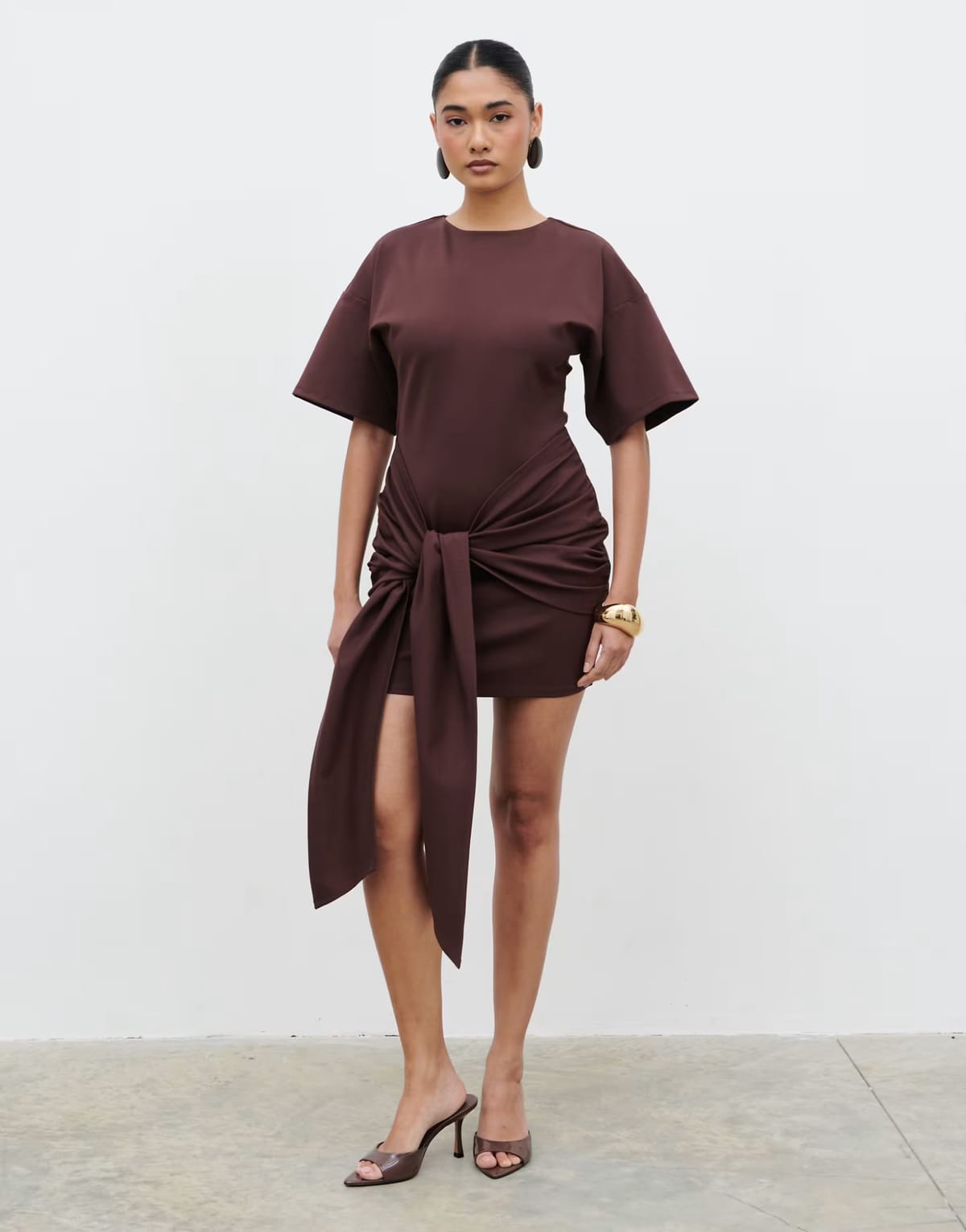 Designed with a dropped shoulder neckline, this brown jersey mini dress features a tie drape detail. Perfect for casual outings or smart-casual events.