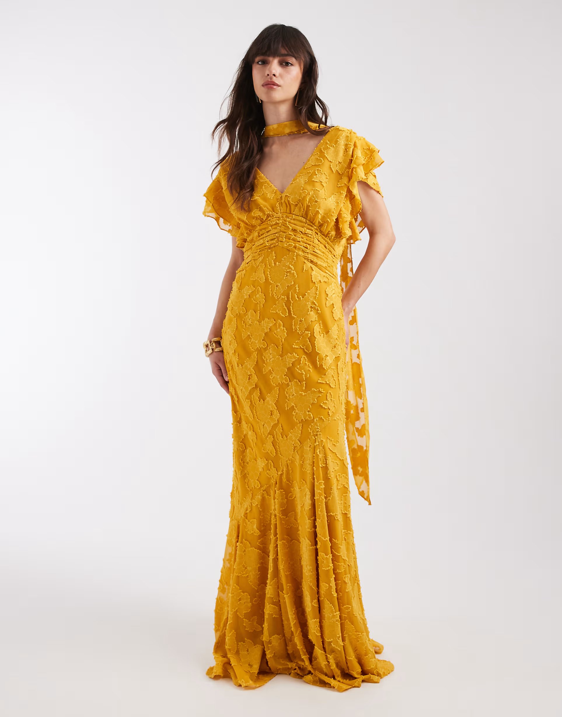The ASOS Pretty Lavish V-Neck Jacquard Maxi Dress in Ochre is ideal for evening, party.