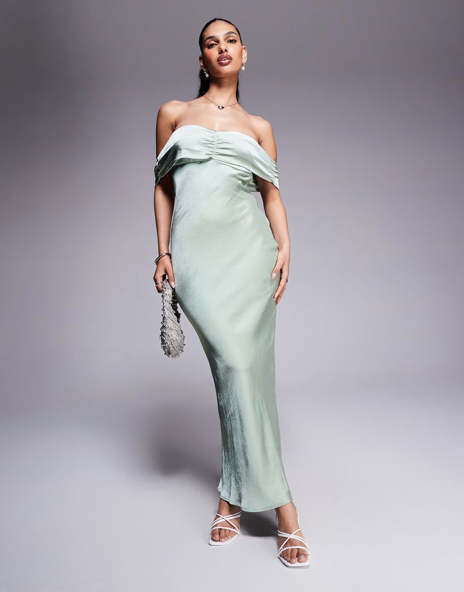 The Princess Polly Sage Satin Maxi Dress with Bardot Neckline is ideal for evening, party, formal.