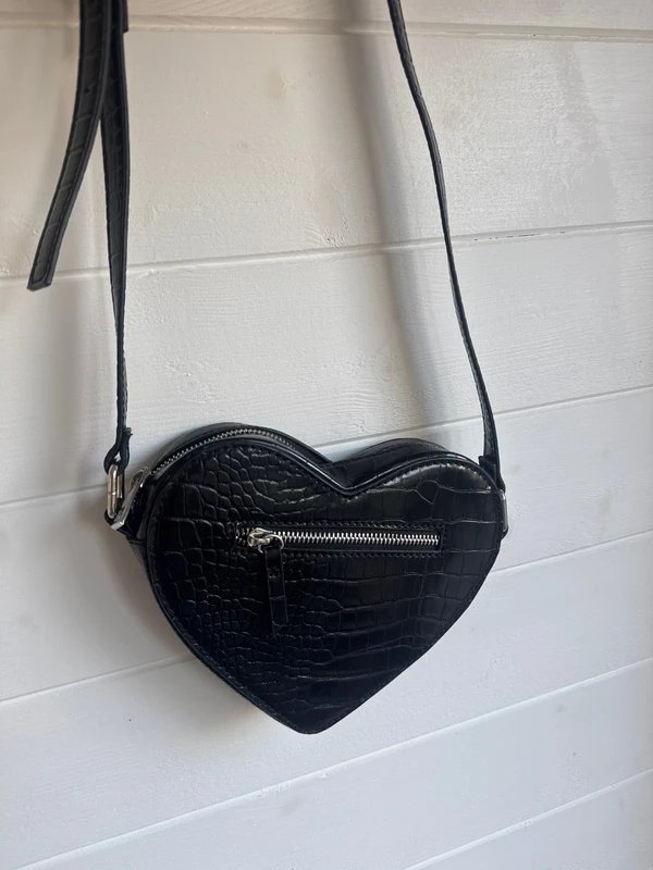 Designed in black, this croc heart-shaped crossbody bag features a long strap for easy wear. Perfect for adding a touch of unusual and alternative cool to your look.