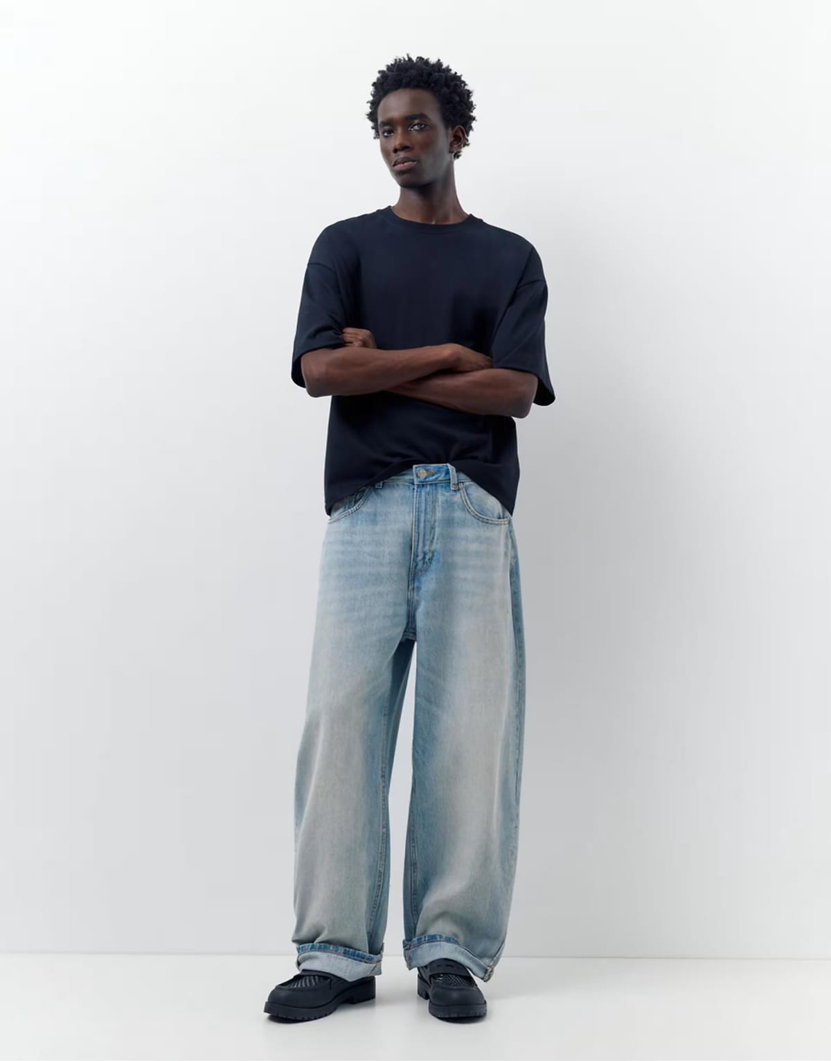 Trendy pale indigo baggy jeans with a balloon fit and distressed finish. Perfect for a casual, laid-back look, these jeans feature a high waist and wide, flared legs.