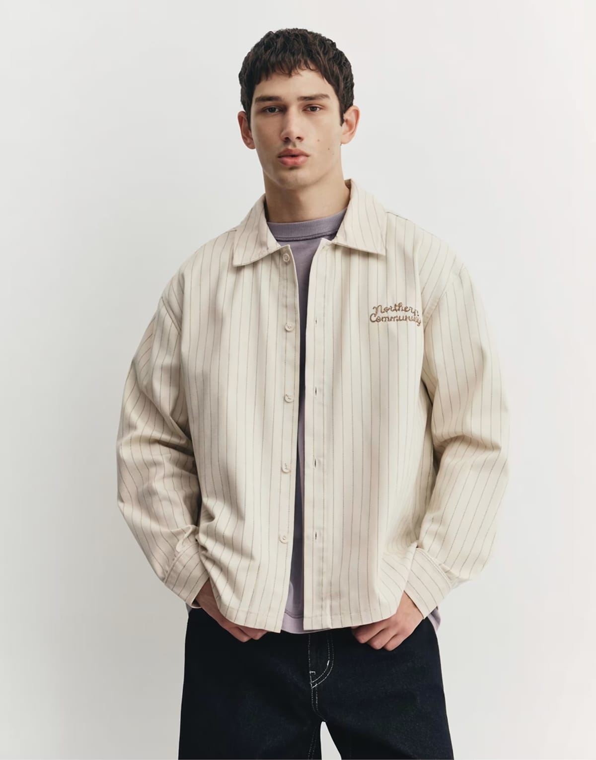 The ASOS Pull&Bear Embroidered Striped Shirt in Beige is available in sizes XXXL, XXL, XL, XS, L, M, S.