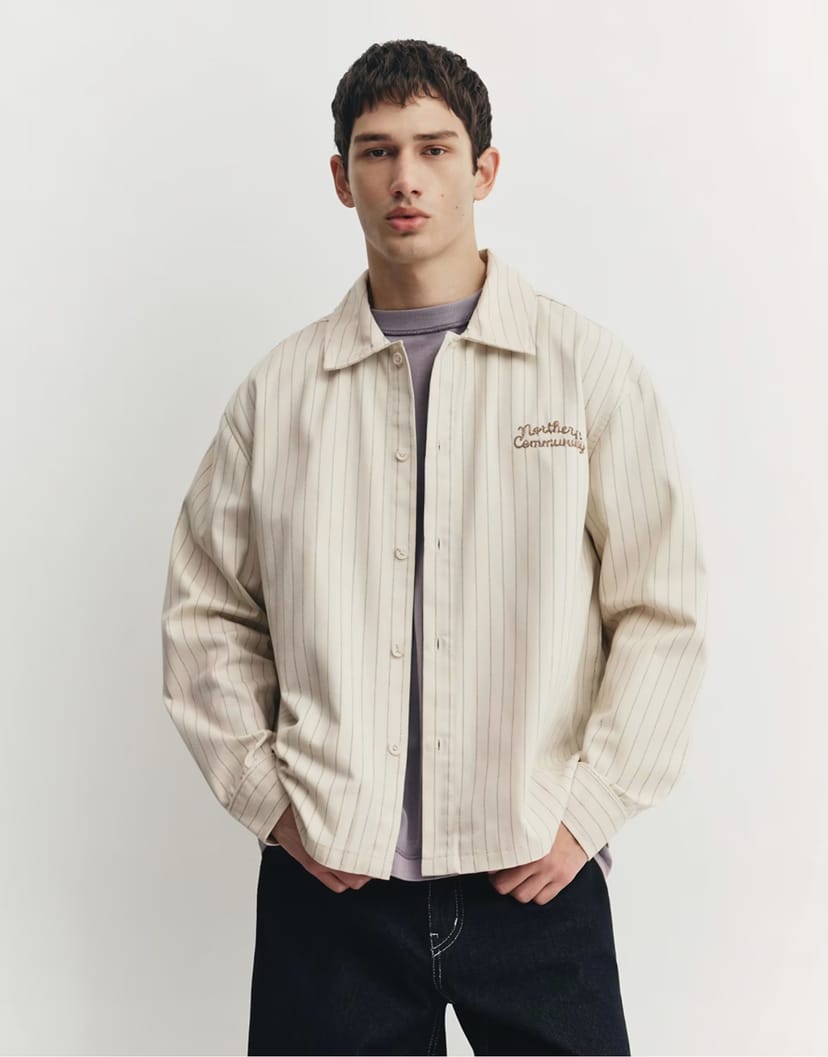 Crafted with a beige hue, this Pull&Bear embroidered striped shirt features embroidered detailing and a buttoned front. Perfect for a casual yet stylish look.