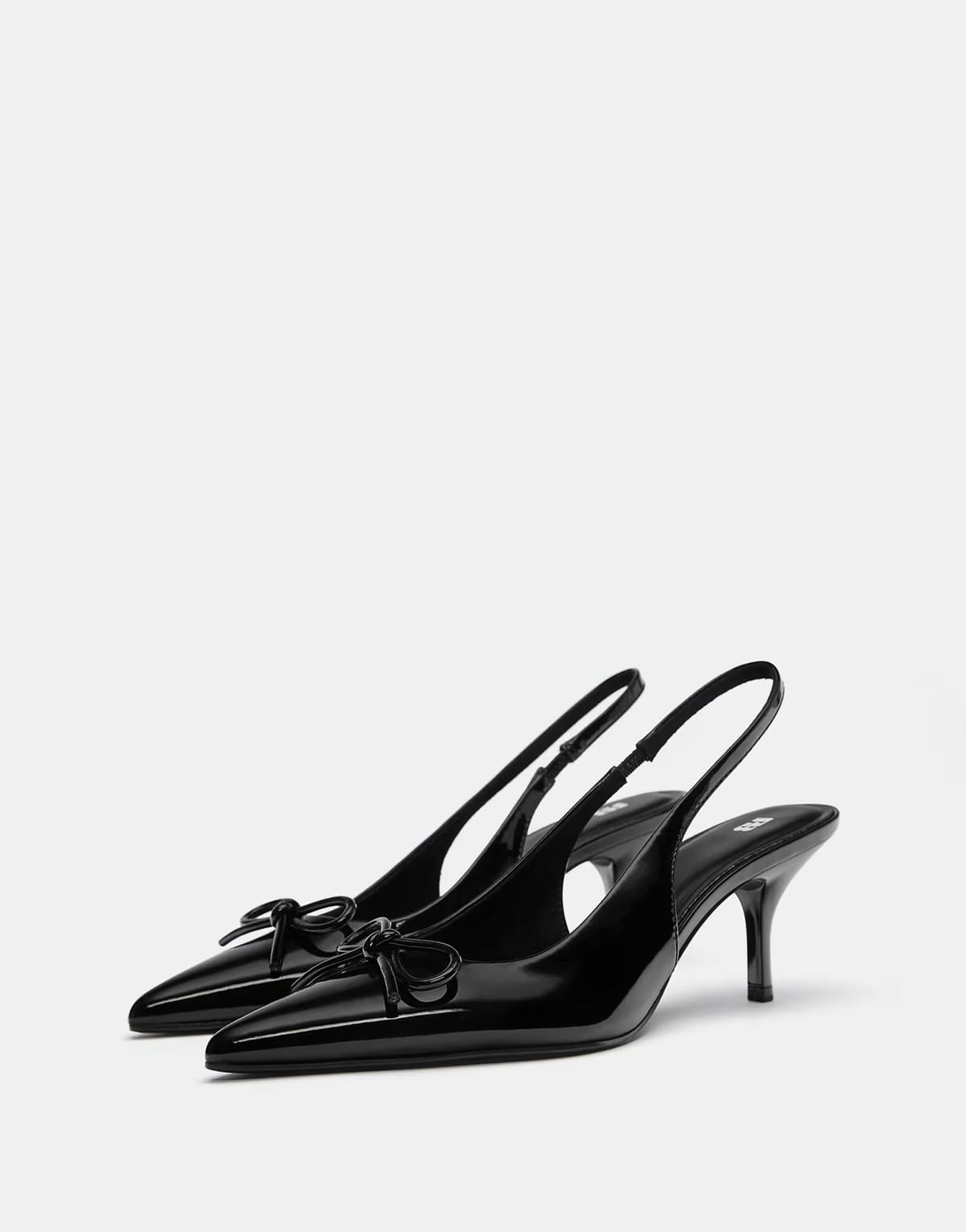 Elegant black faux patent leather high-heel shoes with a pointed toe and a slingback strap featuring a bow detail. Perfect for adding a touch of sophistication to any outfit.