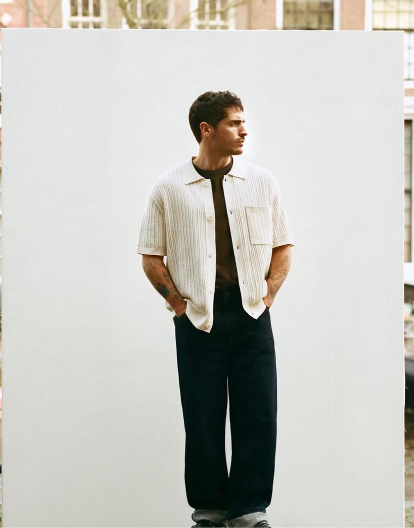See all outfit ideasCasual ASOS off white knit short sleeve shirt with a textured striped pattern and a classic collar. Perfect for everyday wear.