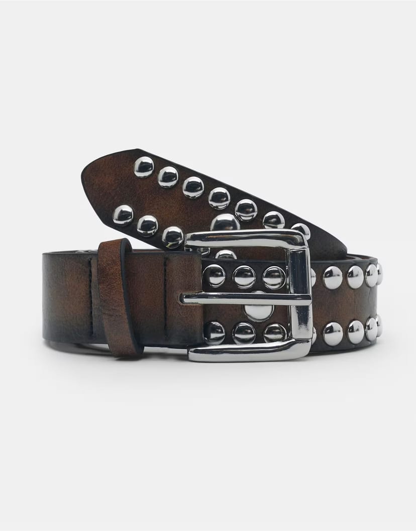 Bold brown leather effect studded belt from ASOS. Features a silver buckle and silver studs for a striking finish. Perfect for adding an edgy touch to any outfit.