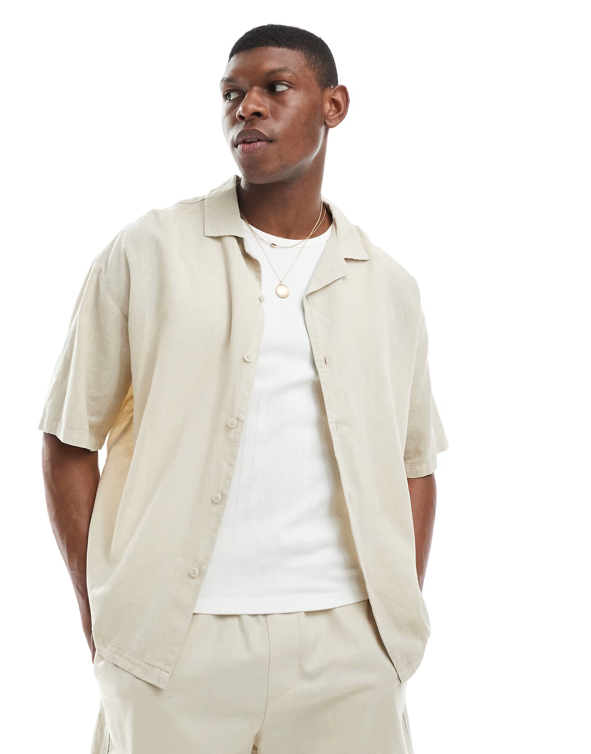 The ASOS Pull&Bear Linen Blend Shirt in Beige is available in sizes XXXL, XXL, XL, XS, L, M, S.