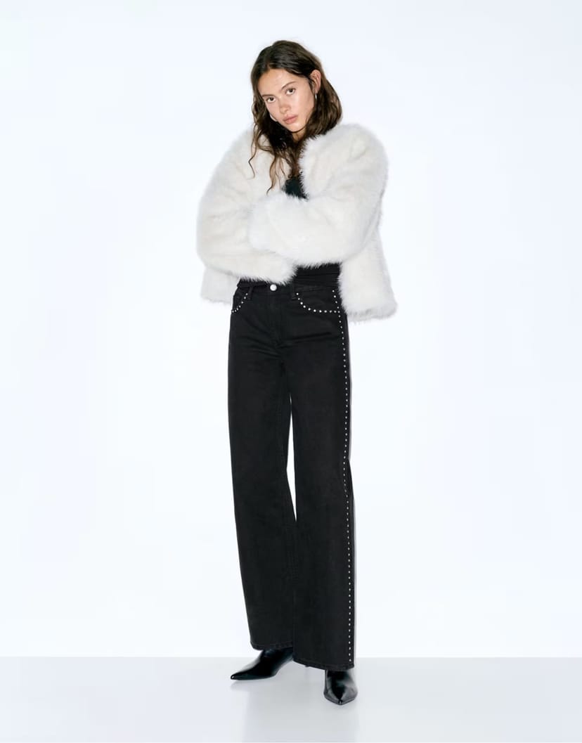 Pull&Bear Studded jeans in faded black feature a wide leg silhouette and embellished detailing. Perfect for a casual look.