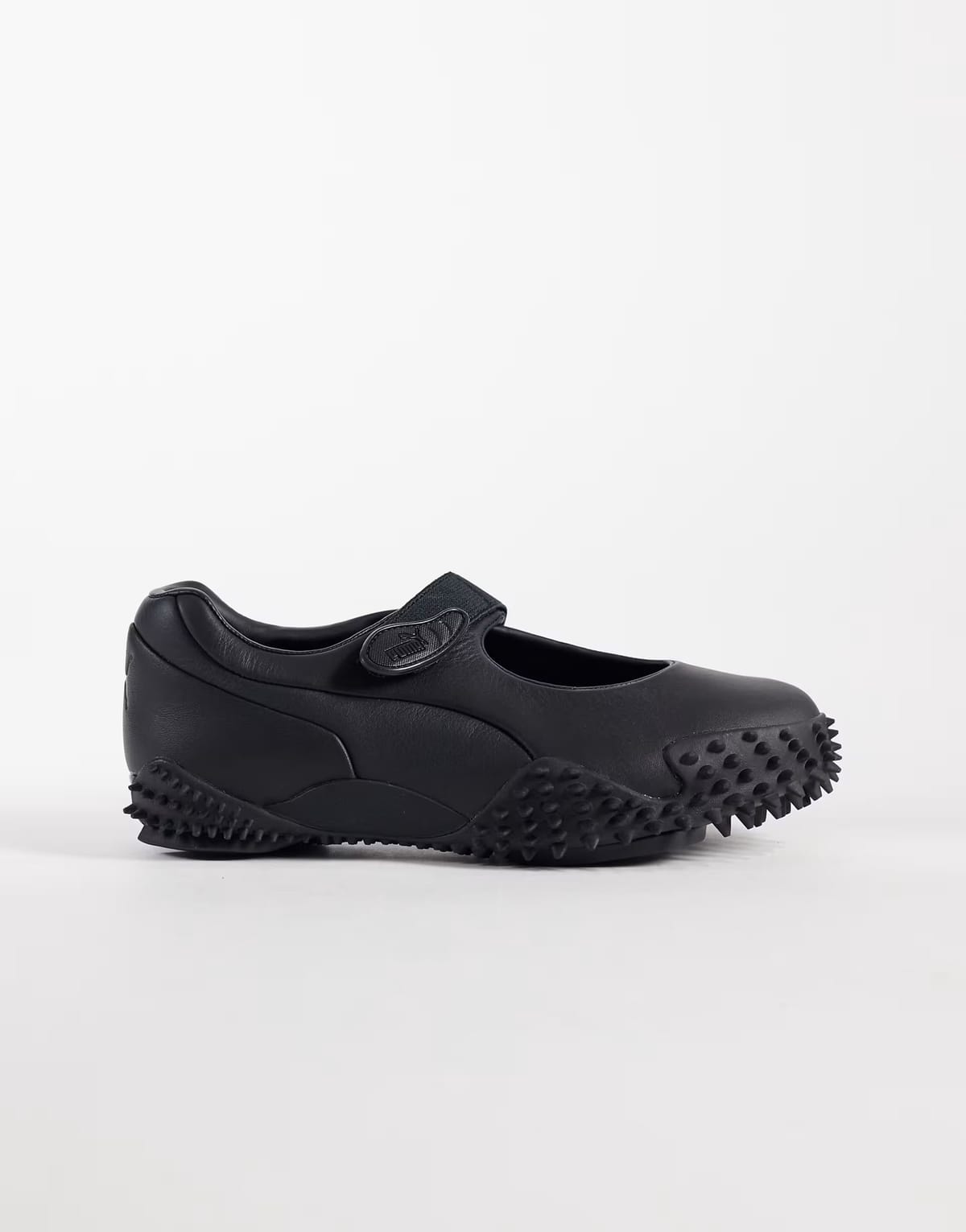 Sleek Puma Mostro Fey trainers in black leather with a textured outsole for enhanced grip. Perfect for everyday wear with a touch of sporty elegance.