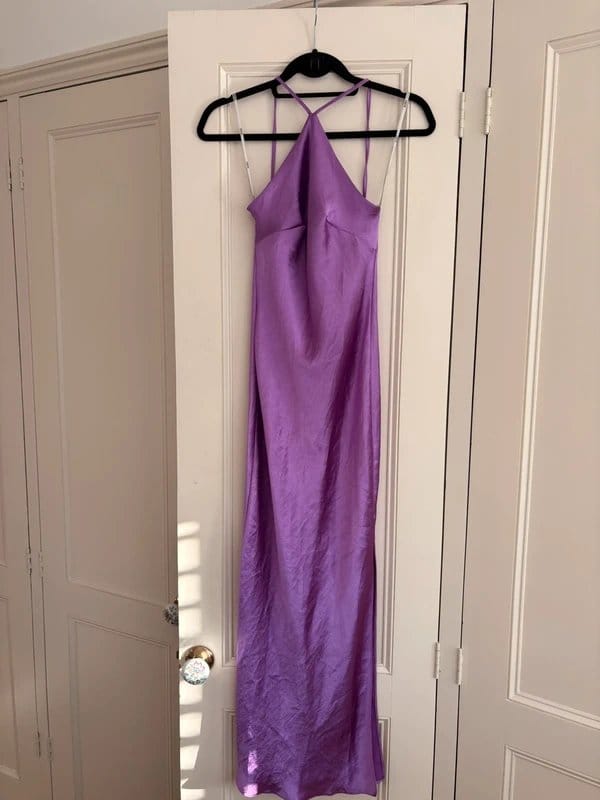The ASOS Purple Satin Halter Neck Long Formal Dress is available in sizes S.