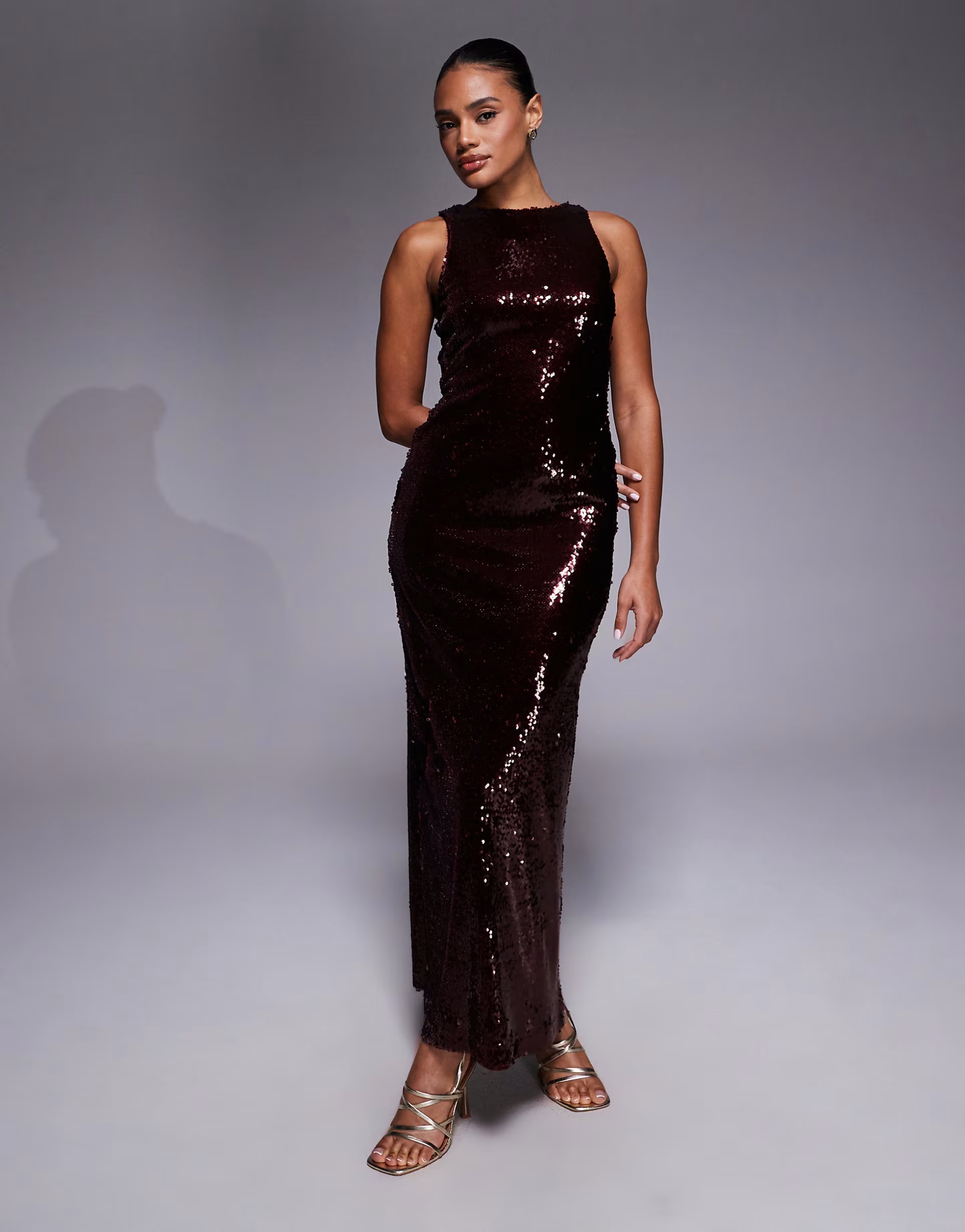 The burgundy maxi dress from Rare London features a stunning sequin texture. This dress is perfect for making a statement at evening events.