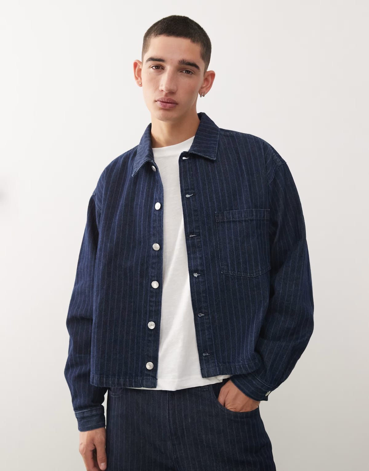 The ASOS Reclaimed Vintage Pinstripe Boxy Jacket in Indigo is made from denim.