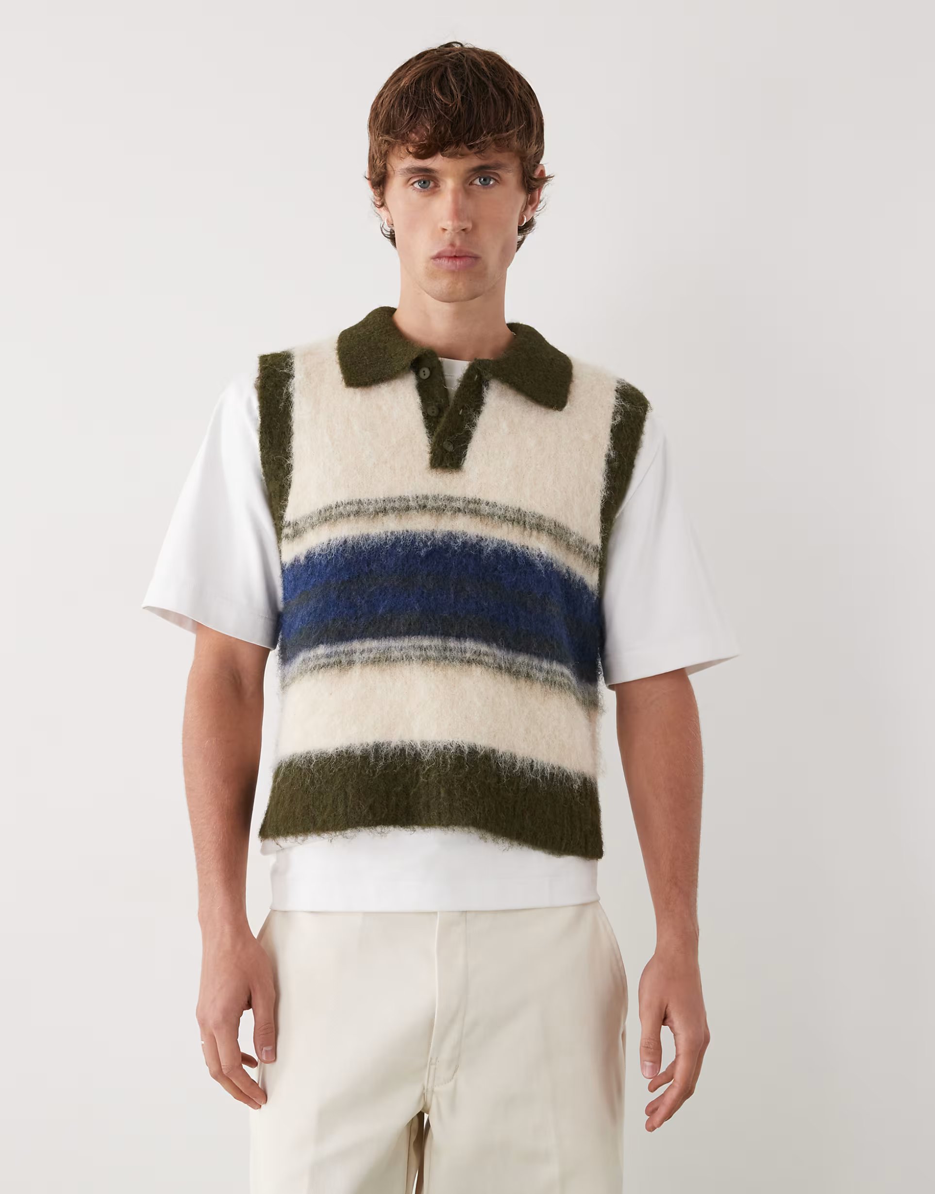 The fluffy knitted tank from ASOS's Reclaimed Vintage collection is perfect for layering. It features a collar detail and comes in a multi stripe pattern.