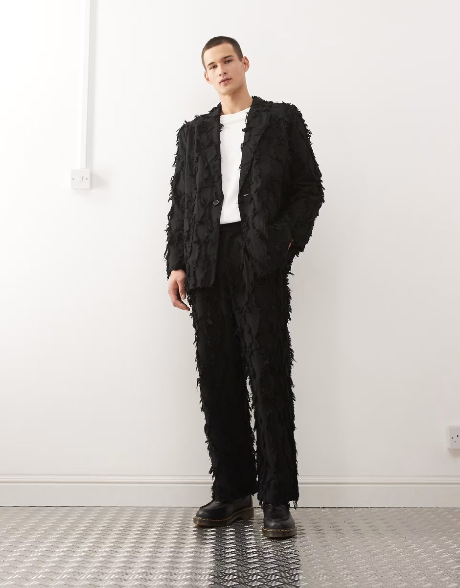 Black Frayed Blazer by Reclaimed Vintage. Designed with fray details and a slim fit. Perfect for casual and evening events. Made from a mix of materials for a unique, stylish look.
