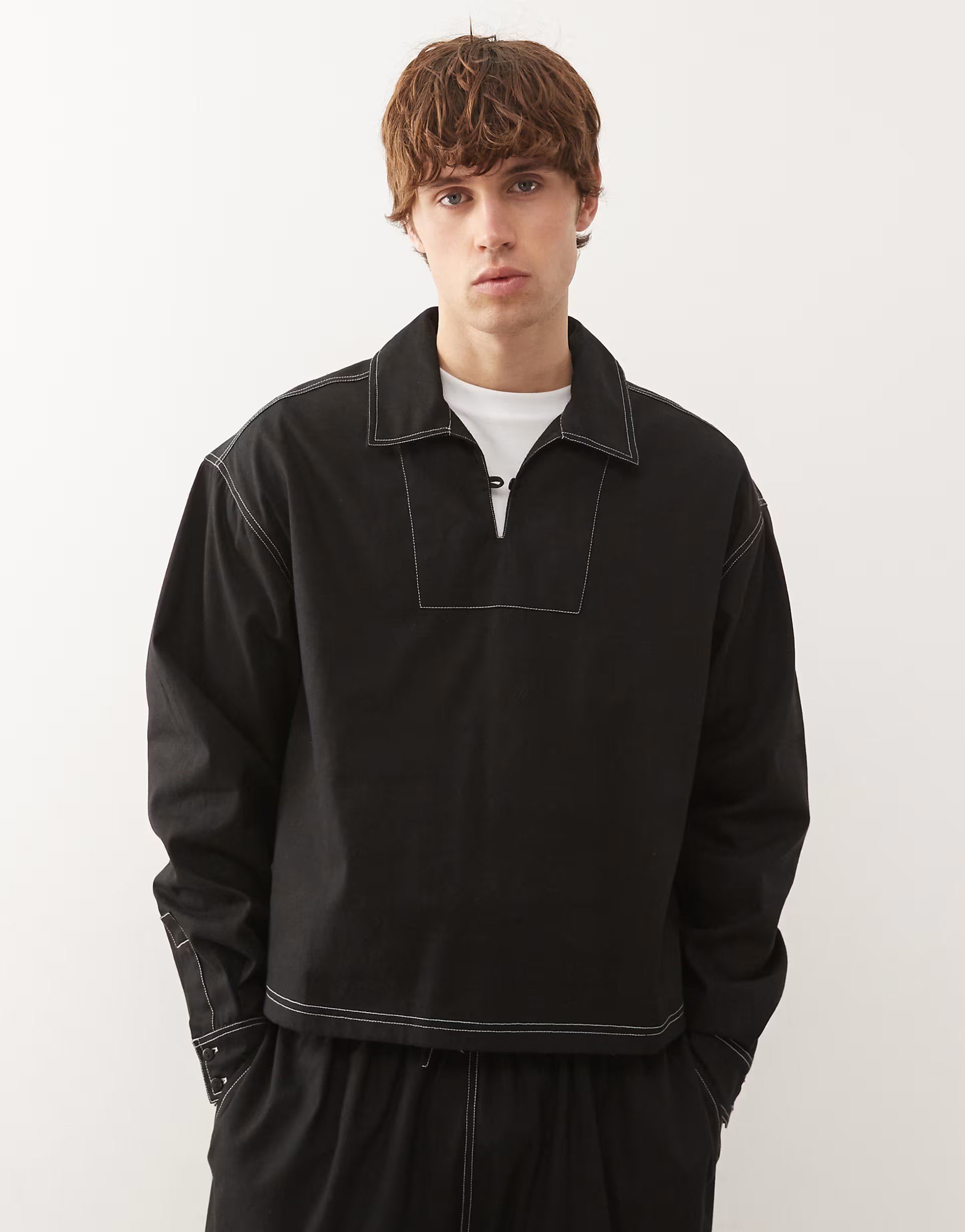The Reclaimed Vintage long sleeve pullover shirt boasts contrast stitching in black. Perfect for a casual yet polished look.