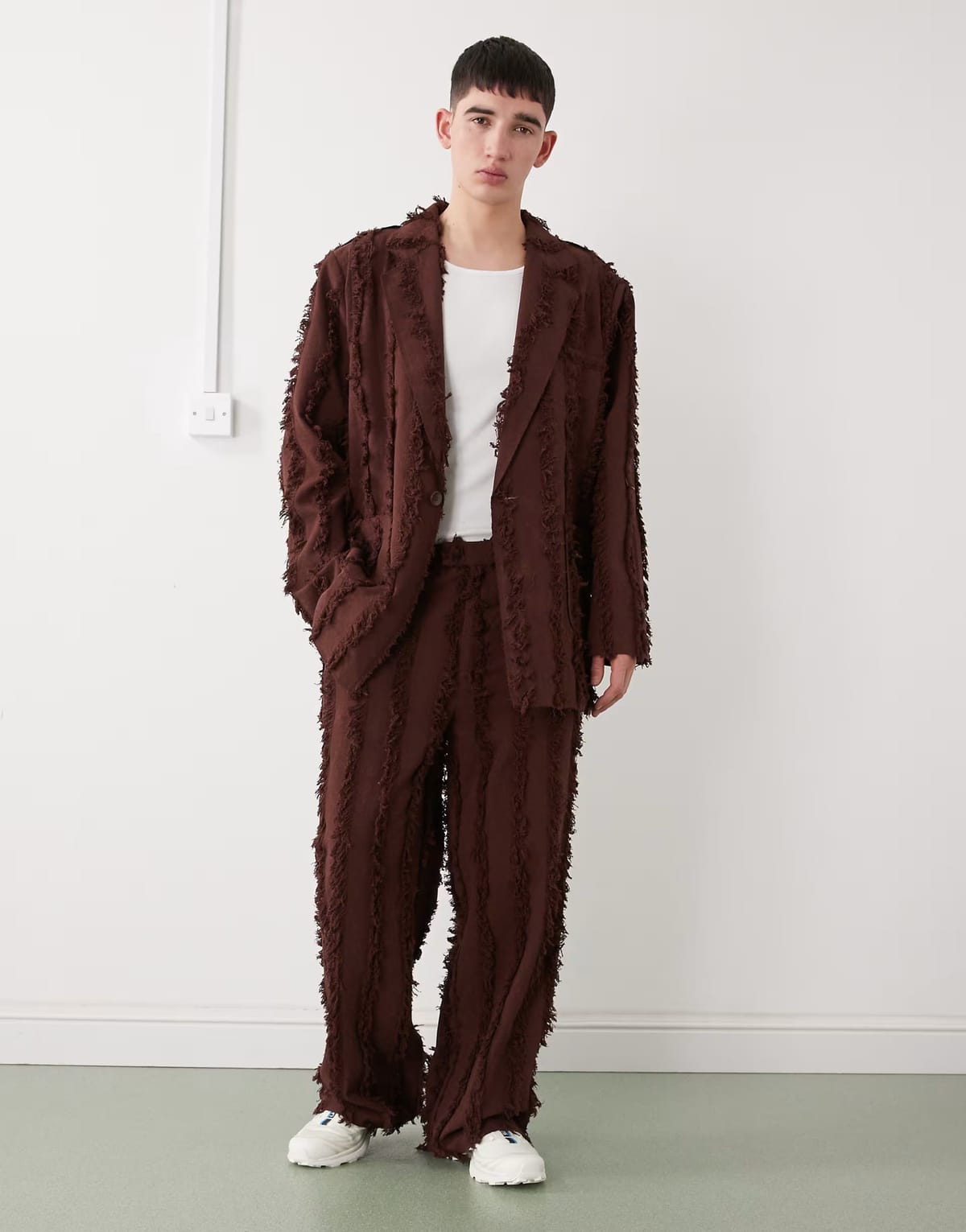 Crafted with a brown oversized frayed suit, this blazer adds an edgy twist to any outfit. Perfect for a casual and modern look.