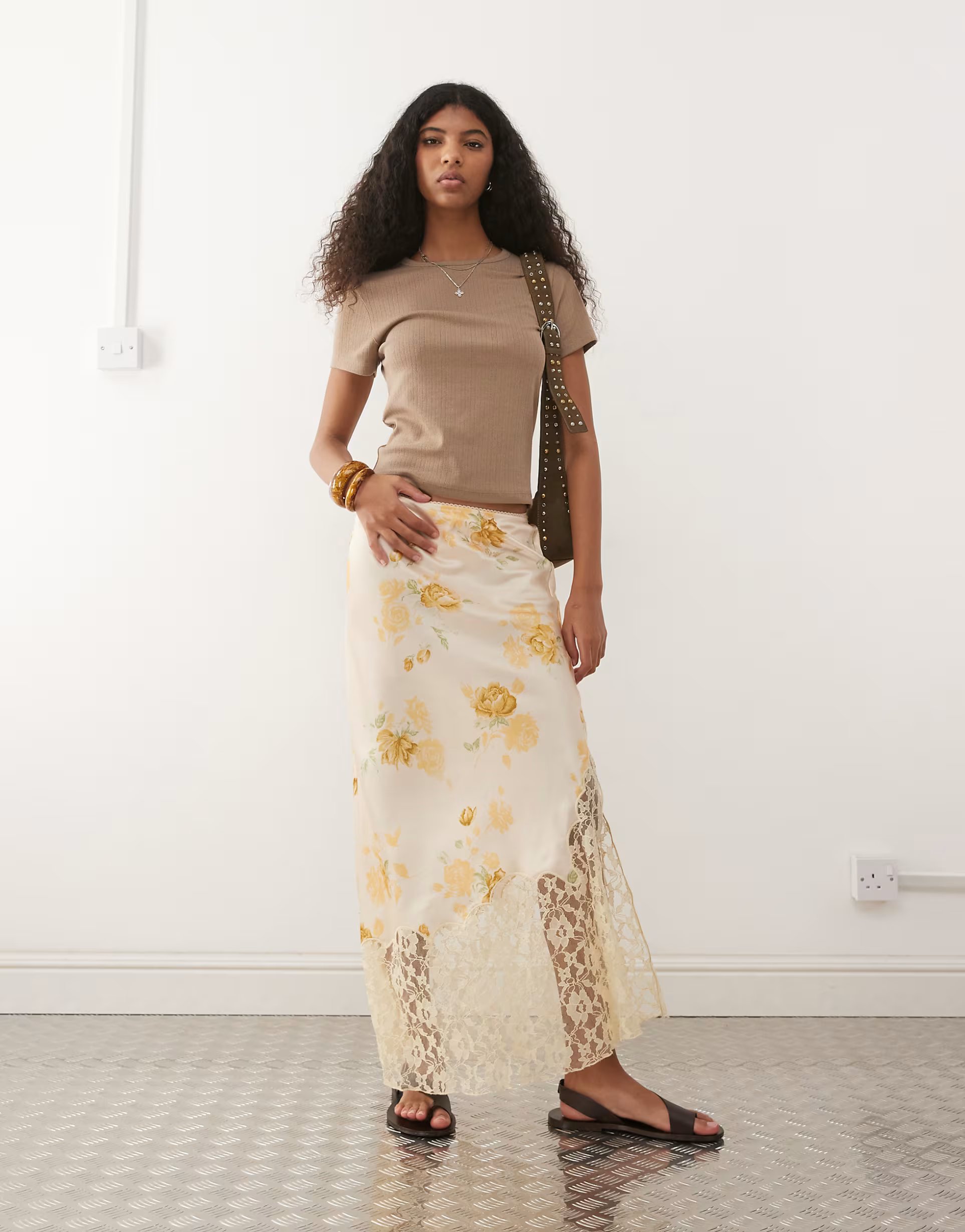 The ASOS Reclaimed Vintage Floral Midi Skirt in Yellow is made from satin, lace.