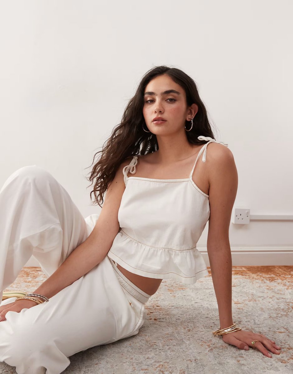 The Reclaimed Vintage soft denim twill tie strap peplum top co-ord in ecru is perfect for casual wear. Featuring a peplum top with tie strap detailing, it adds a touch of vintage flair to your wardrobe.