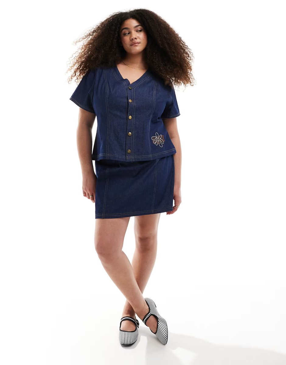 The ASOS Renee Studio Denim Button Front Top and Mini Skirt Co-ord is ideal for casual, smart-casual.