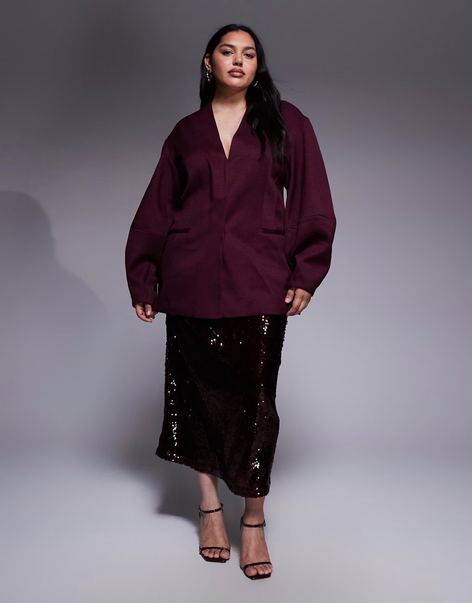 The ASOS Renee Studio High Waisted Sequin Maxi Skirt in Burgundy is available in sizes XXXL, XXL, XL, XS, L, M, S.