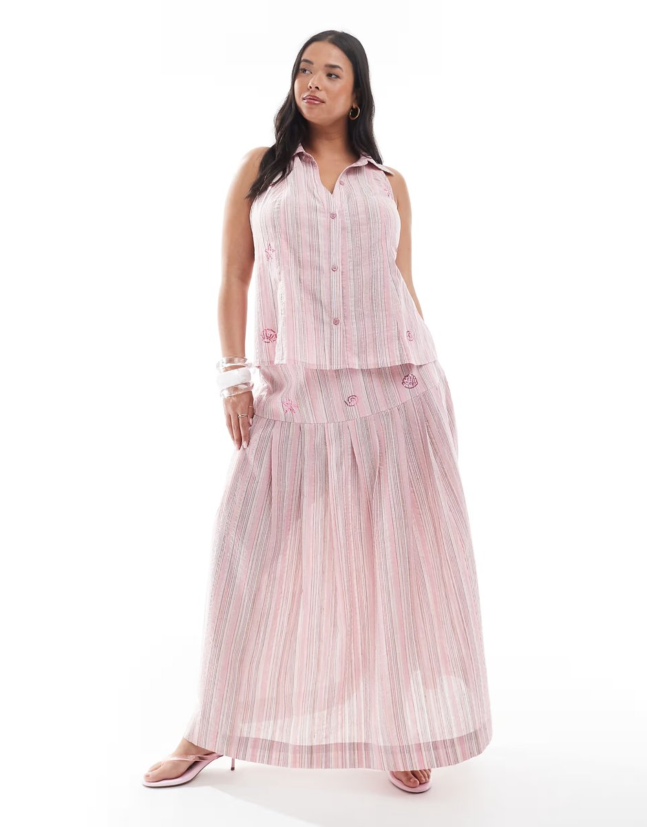 The ASOS Pink Stripe Halter Sequin Top and Pleated Maxi Skirt Co-ord is available in sizes XXXL, XXL, XL, XS, L, M, S.