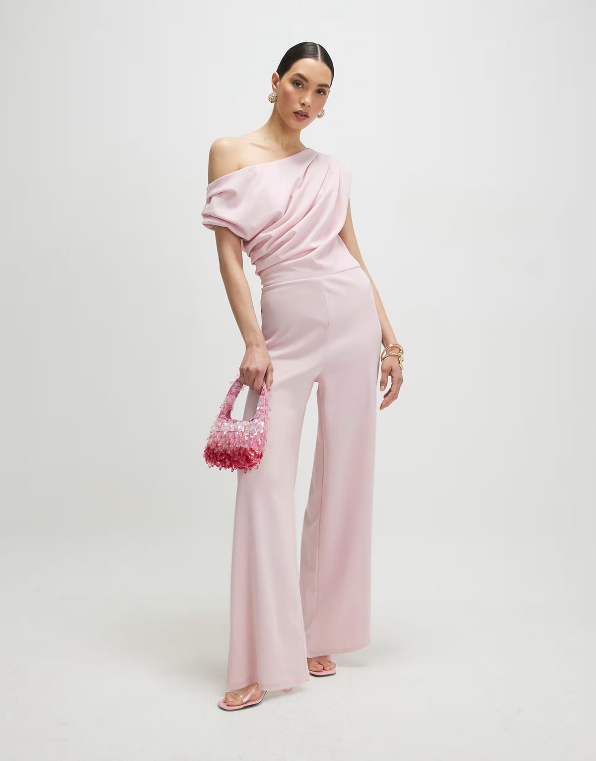 See all outfit ideasStylish pink satin jumpsuit with an asymmetric drape design. Features a one-shoulder neckline and wide-leg pants for a modern and elegant look. Perfect for evening events or special occasions.