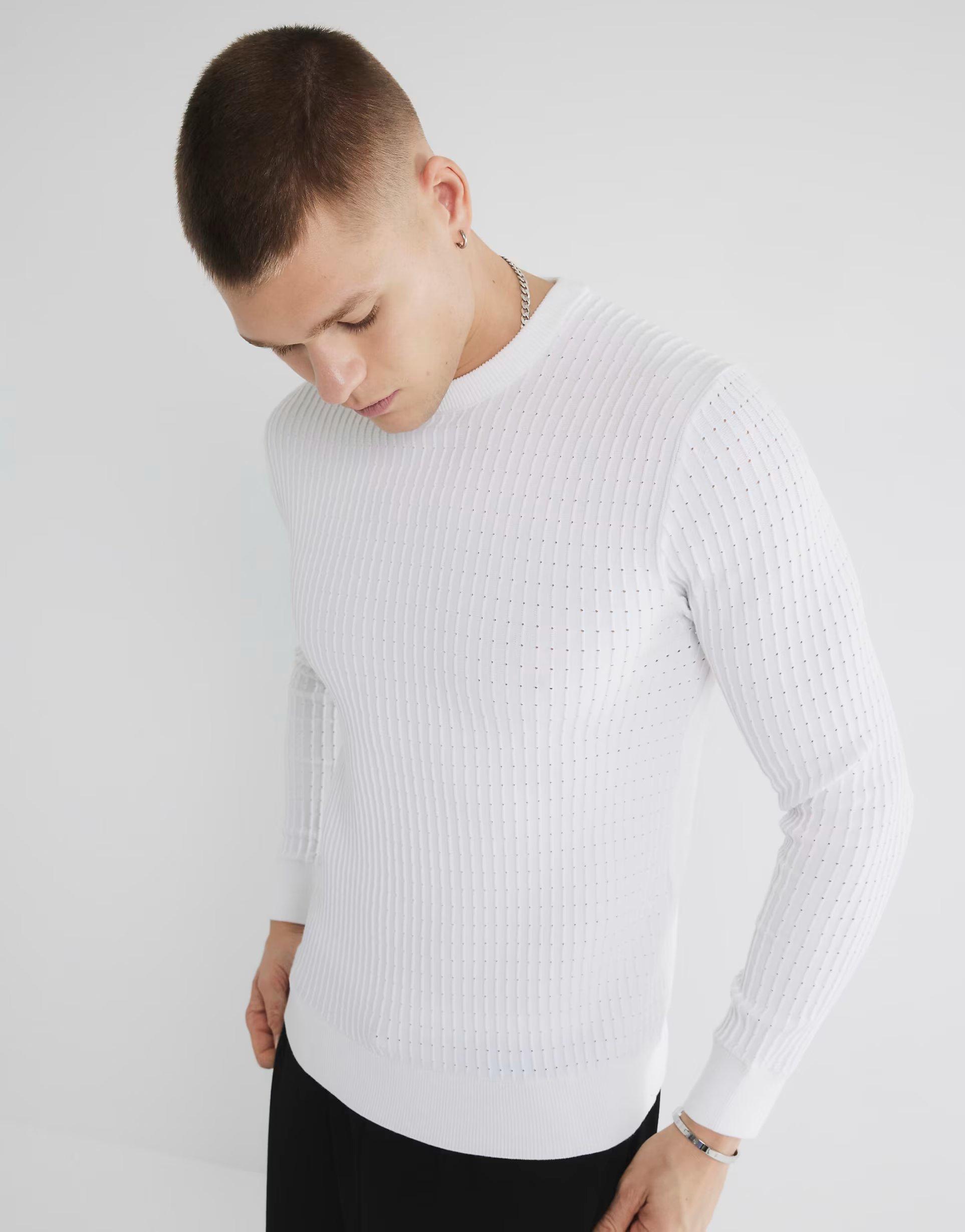 White Textured Jumper — the must-have jumper for casual, smart-casual events. Designed with white, long sleeve, crew neckline, muscle fit, textured material. Features modern, casual style for a versatile look.