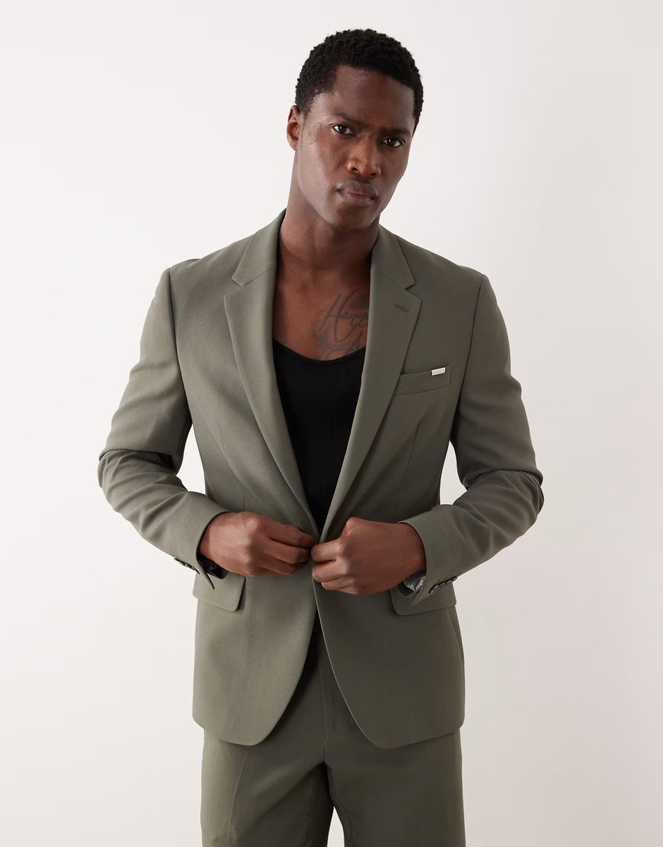 Crafted with a medium green hue, this skinny fit suit jacket by River Island from ASOS features a sleek silhouette perfect for business-casual occasions. The two-button closure and tailored fit ensure a polished look.
