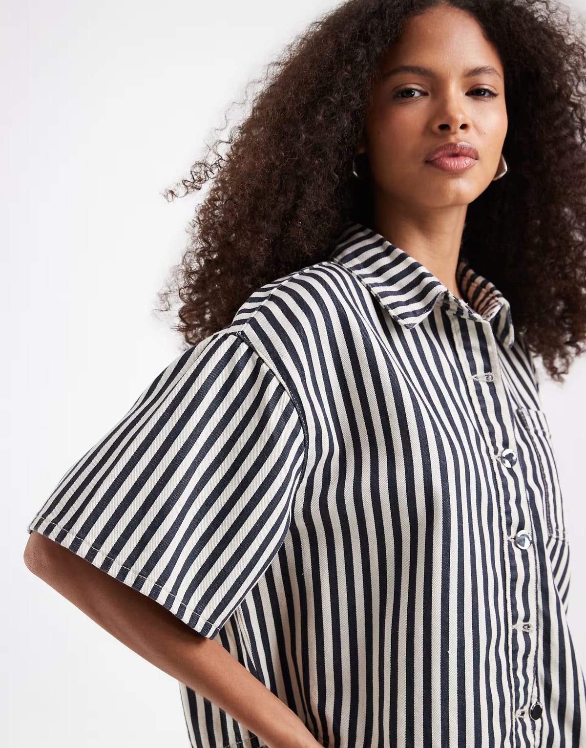 This boxy-fit shirt from ASOS features a striped pattern in white and navy. Made from denim fabric, it offers a casual yet stylish look perfect for everyday wear.